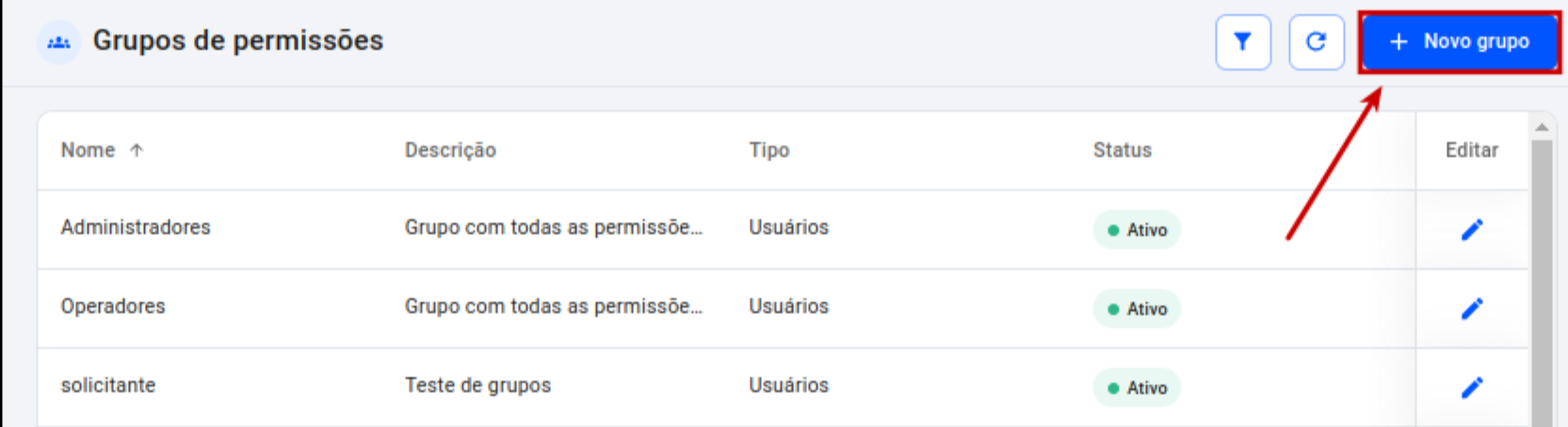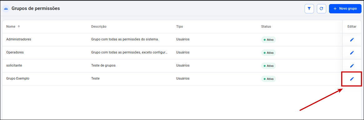 Passo 1: Caso deseje modificar um grupo já existente basta clicar em “Editar” e alterar a informação desejada