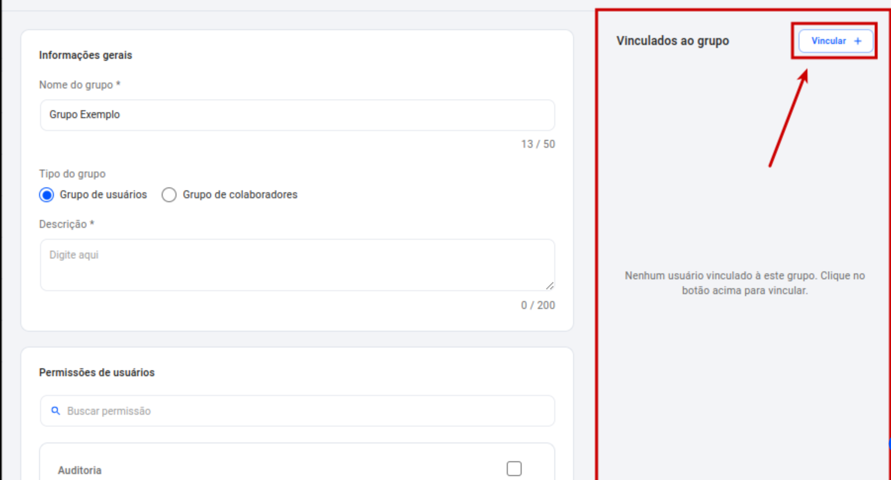 Passo 4: Agora, ao lado você pode adicionar os usuários que farão parte desse grupo. Basta clicar em "Vincular" e selecionar o usuário que deseja