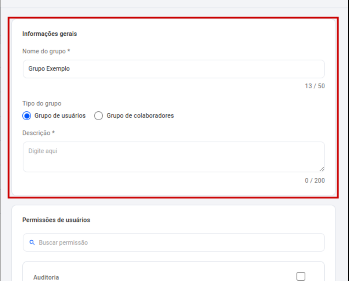 Passo 3: Preencha os campos, definindo o nome do grupo, tipo do grupo e uma descrição.
