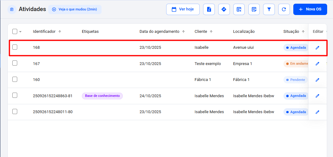 Pronto! Agora a O.S. será listada dessa forma em sua tela de atividades