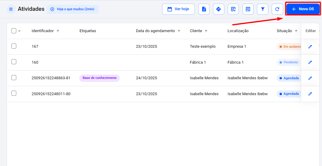Passo 2: Clique no botão "Nova OS" no canto superior, para criar uma nova Ordem de Serviço.