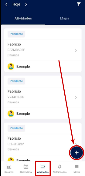 Passo 1: No aplicativo, acesse a tela de atividades e clique em "+" no canto inferior da tela