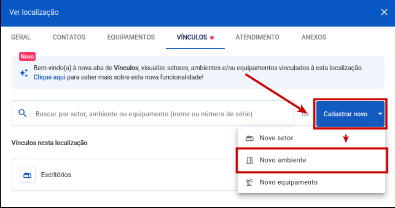 Passo 1: Ainda na aba de vínculos, clique novamente em "Cadastrar novo" e selecione "Novo ambiente"