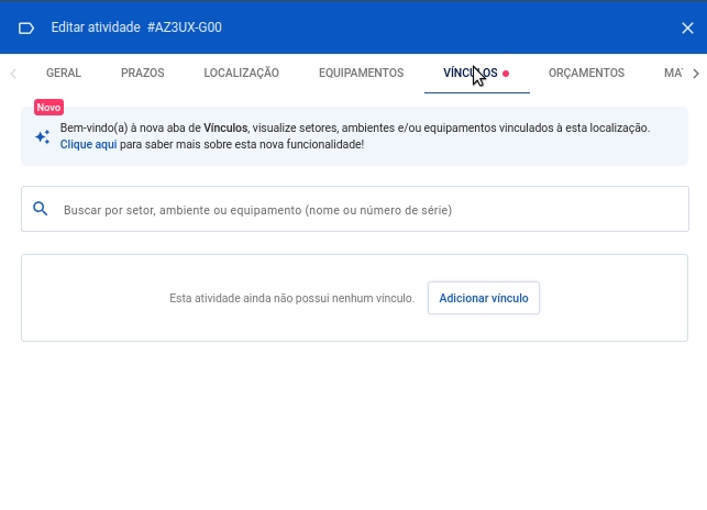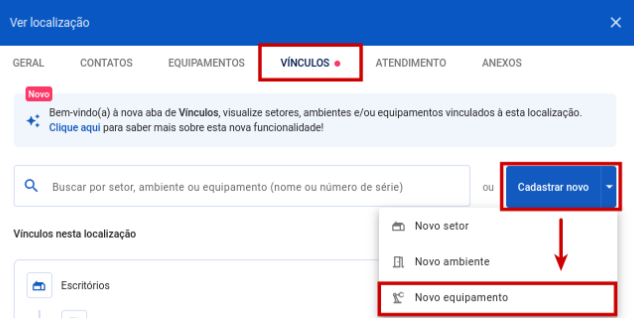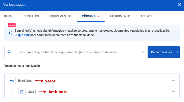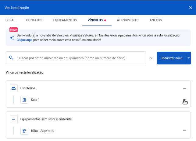 Na aba Vínculos, você pode cadastrar um novo equipamento para aquele setor/ambiente ou apenas vincular um equipamento já existente