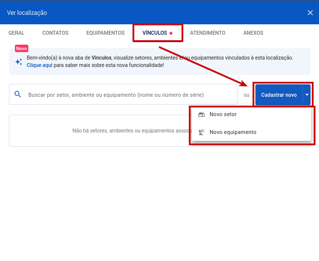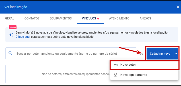 Passo 3: Agora basta acessar a aba "Vínculos". Clicando em "Cadastrar novo", será possível cadastrar um setor ou equipamento
