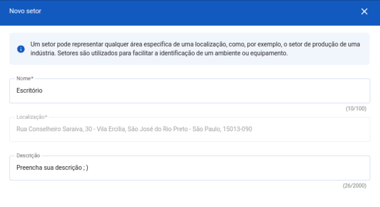 Passo 2: Preencha o nome e selecione o setor que esse ambiente fará parte. Feito isso, basta clicar em "Criar"