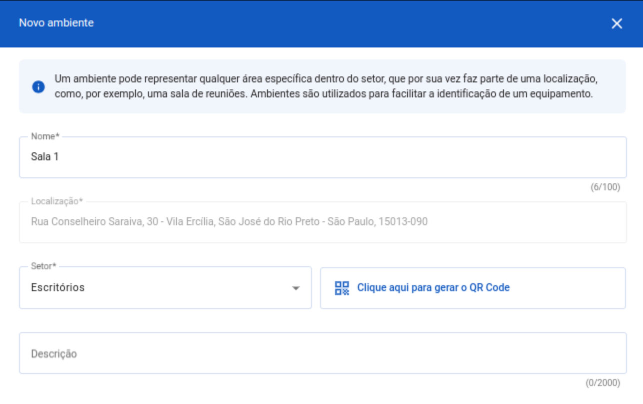Preencha as informações do equipamento e selecione o setor e ambiente que ele fará parte. Feito isso basta clicar em "Criar"