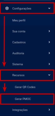 Passo 1: Para realizar o cadastro de PMOC vá em Configurações >> Recursos >> Gerar PMOC