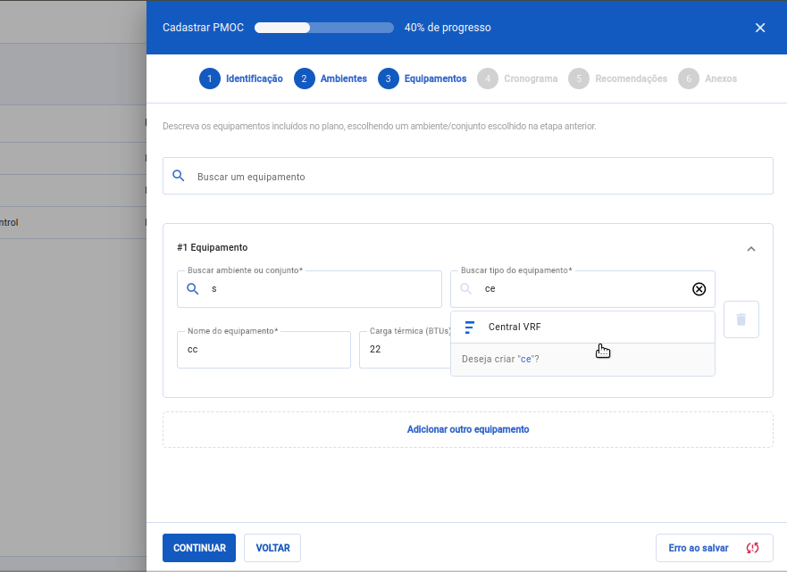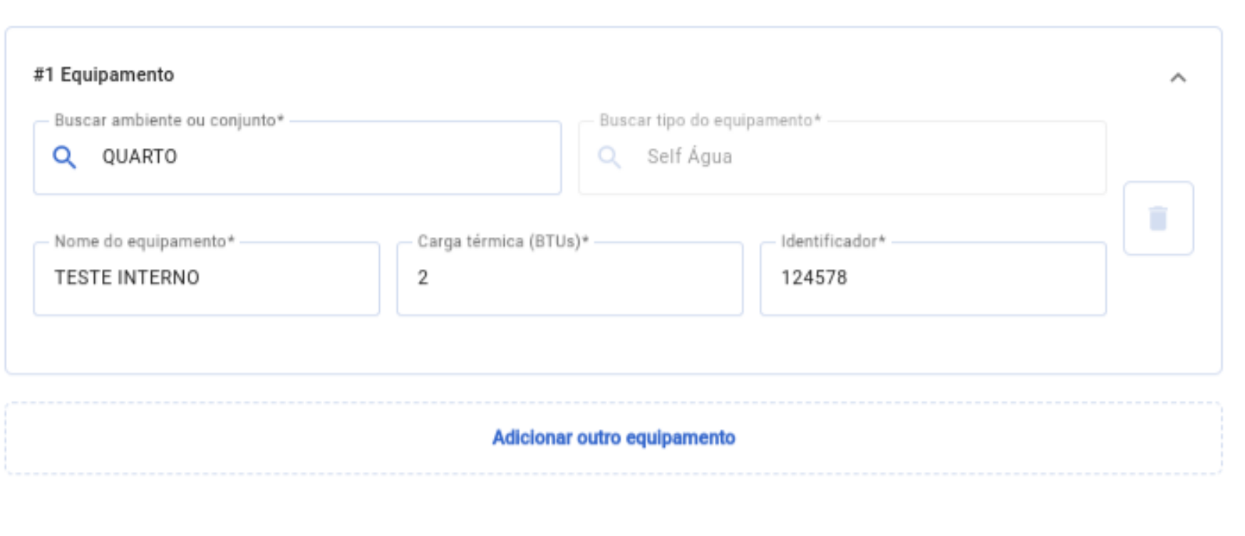 Basta preencher com o ambiente/ conjunto, o tipo do equipamento e as demais informações