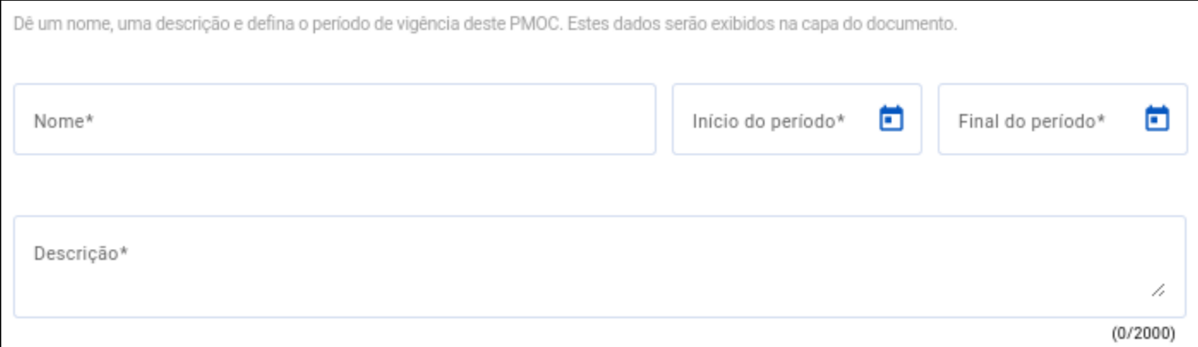 Nessa primeira etapa, comece preenchendo o nome que deseja para o PMOC e também o período de vigência