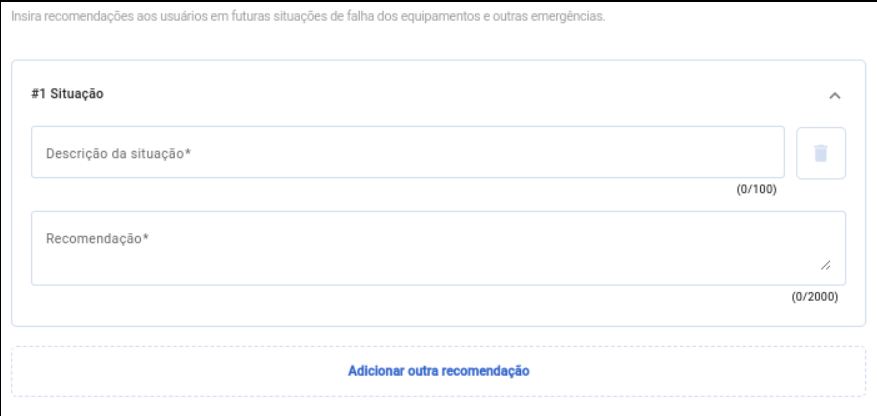 Nessa tela, preencha com recomendações no caso de futuras situações de falha nos equipamentos ou alguma outra emergência