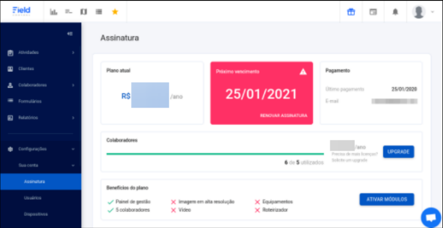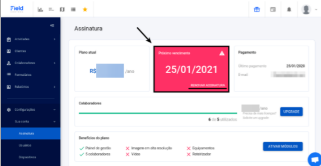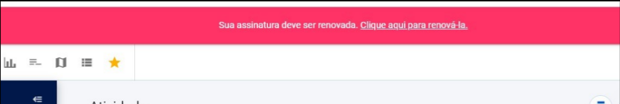 A plataforma Field Control informa num período de 15 dias de antecedência quando será necessário renovar a assinatura. Uma caixa de aviso no topo da página irá lhe notificar a necessidade de renovação, como na imagem abaixo