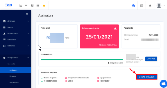 Passo 1: Na tela de Assinaturas, clique no botão "Ativar módulos".
