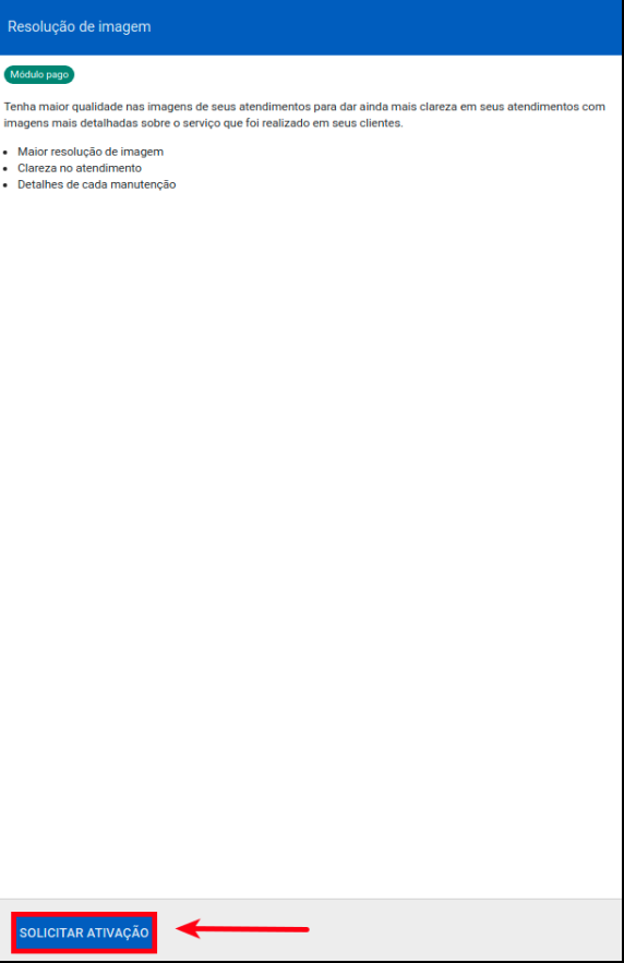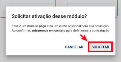 Passo 3: Ao selecionar o módulo que deseja ativar uma aba será aberta, clique no botão "Solicitar ativação". Uma caixa de mensagens confirmando o pedido será exibida, clique em "Solicitar".