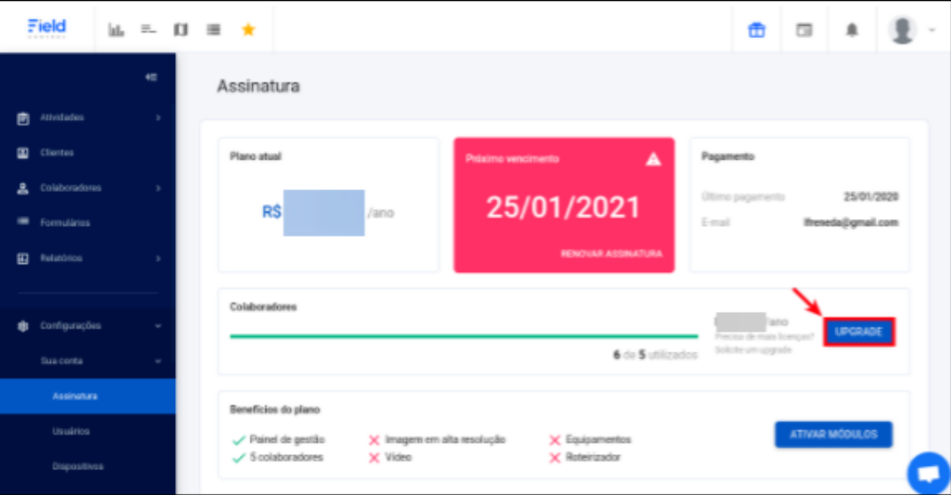 Passo 1: Na tela de Assinaturas clique em "Upgrade".