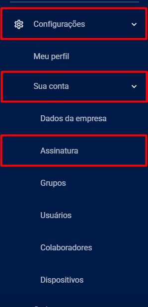 Passo 1: Ao entrar no painel do gestor, no menu à esquerda clique em Configurações » Sua conta » Assinatura