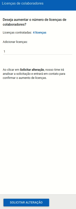 Passo 2: A aba Licença de colaboradores se abrirá, onde é possivel ver quantas licenças já estão contratadas. Agora, basta digitar o número de licenças que deseja e clicar no botão "Solicitar alteração".