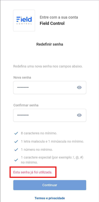 Por motivos de segurança, o sistema não permite o uso de senhas recentes, evitando que acessos antigos comprometam a conta.
