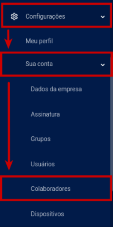 Passo 1: No menu esquerdo, vá em Configurações » Sua conta » Colaboradores.
