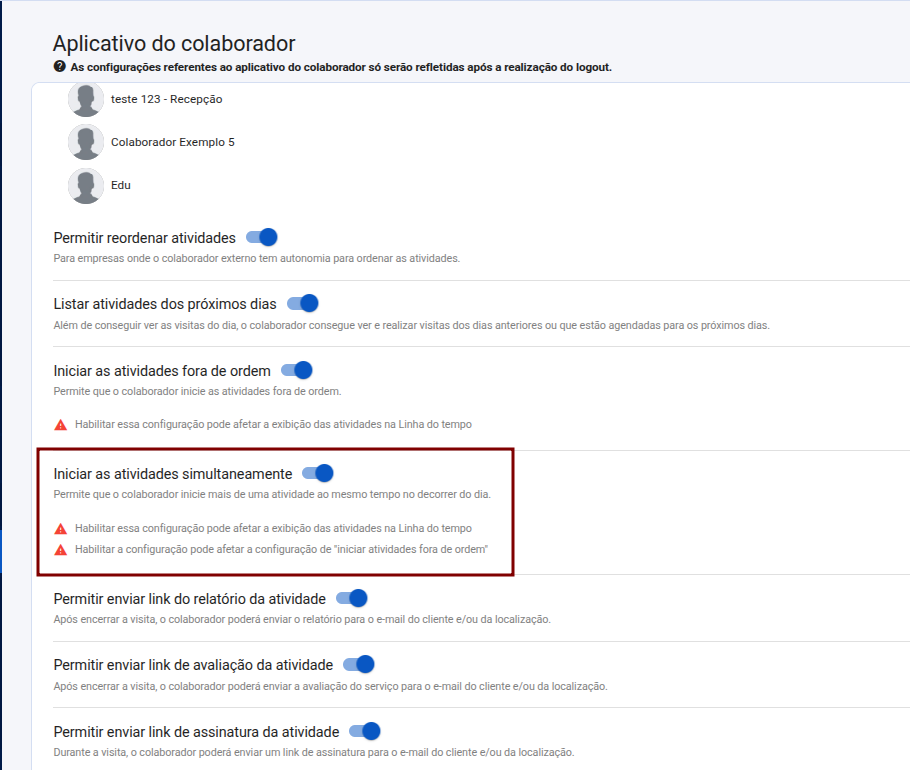 Passo 3: Feito isso, os colaboradores poderão iniciar mais do que uma atividade ao mesmo tempo.