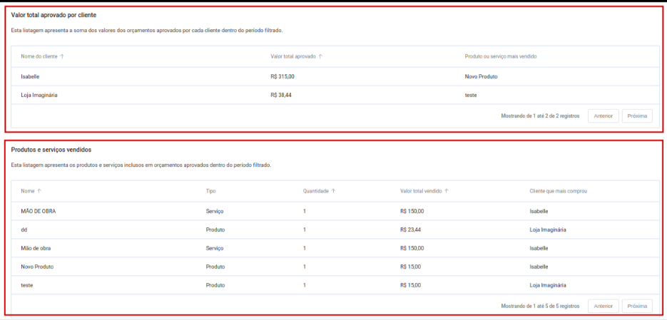 Finalizando o relatório, você pode visualizar a soma dos valores dos orçamentos de cada cliente no período filtrado (Valor total aprovado por cliente), e os produtos e serviços inclusos nos orçamentos do período filtrado (Produto e serviços vendidos)