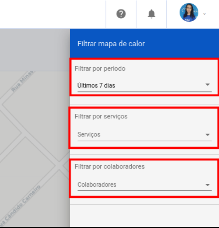Nessa tela é possível filtrar por Serviço, Colaborador e Período para gerar o relatório de calor. Vamos falar mais sobre esses filtros daqui a pouquinho!