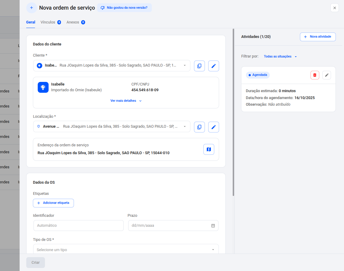 A tela de criação de ordem de serviço aparecerá no seu painel.