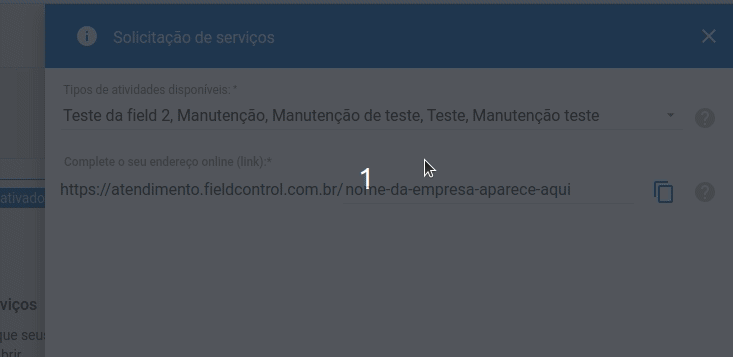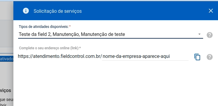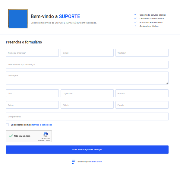 As solicitações de serviços permitem que a empresa que usa o Field Control crie um endereço online (link) e compartilhe com seus clientes. Esse link pode ser acessado pelos clientes de sua empresa via computador ou celular.