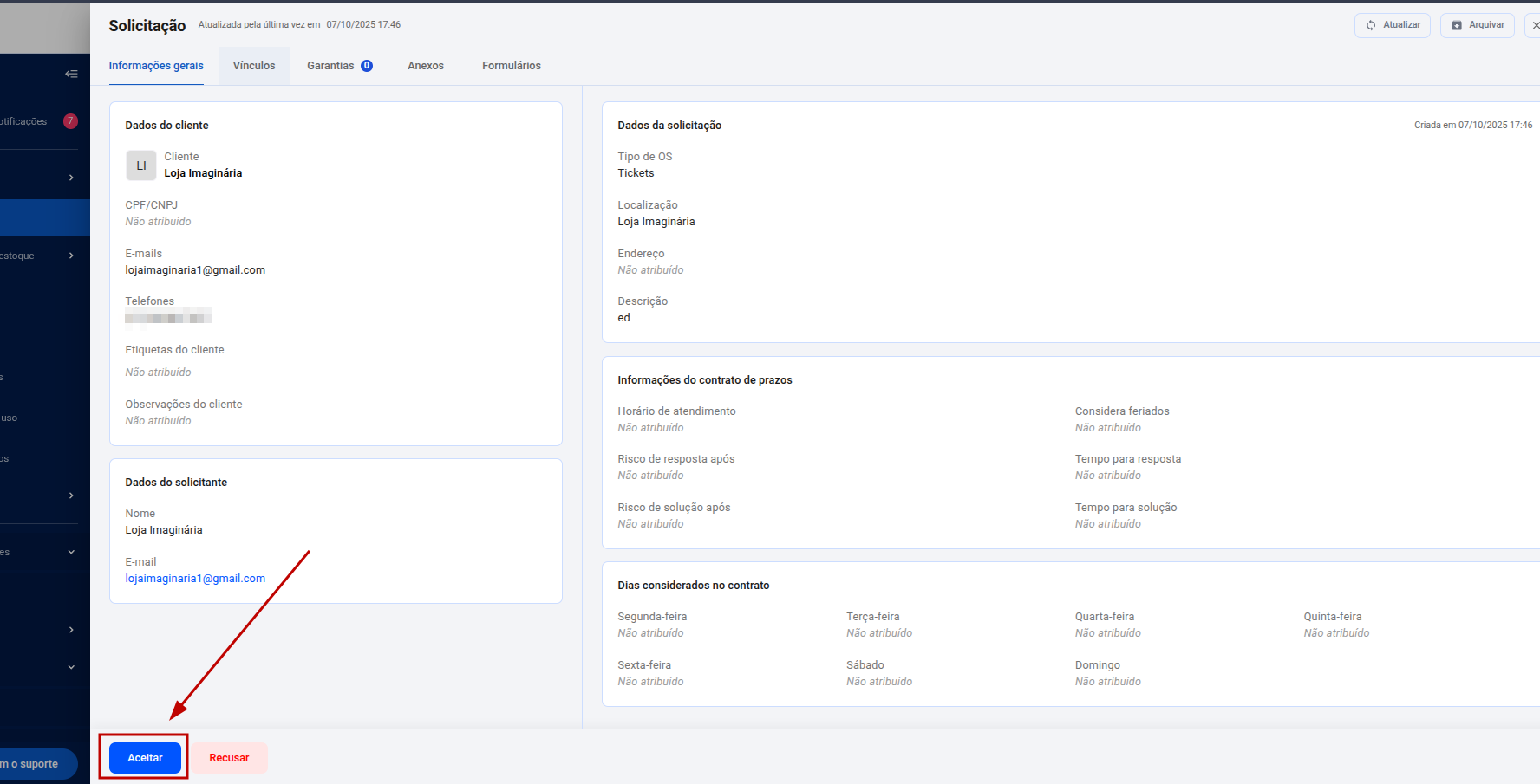 É possível criar uma ordem de serviço a partir de cada solicitação. Para fazer isso basta clicar em "Ver detalhes" na solicitação que deseja, e depois em "Aceitar"