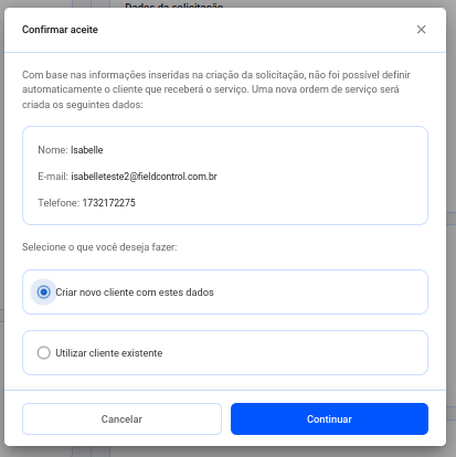 Após confirmar a solicitação, o Field Control irá perguntar se você deseja criar um novo cliente ou atribuir a ordem de serviço a um cliente já existente. Se optar por utilizar um cliente já existente, basta selecionar a opção, escolher o cliente e clicar em Continuar.