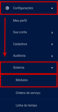 Passo 1: Para habilitar a solicitação de serviços para a sua conta basta acessar pelo menu lateral esquerdo as Configurações >> Sistema >> Módulo.