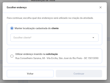 Você também pode escolher utilizar o endereço fornecido na solicitação, ou manter a localização do cliente cadastrado no painel. Após definir, basta clicar em Continuar