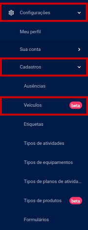 Passo 1: Para cadastrar um veículo você deve ir em Configurações » Cadastros » Veículos.