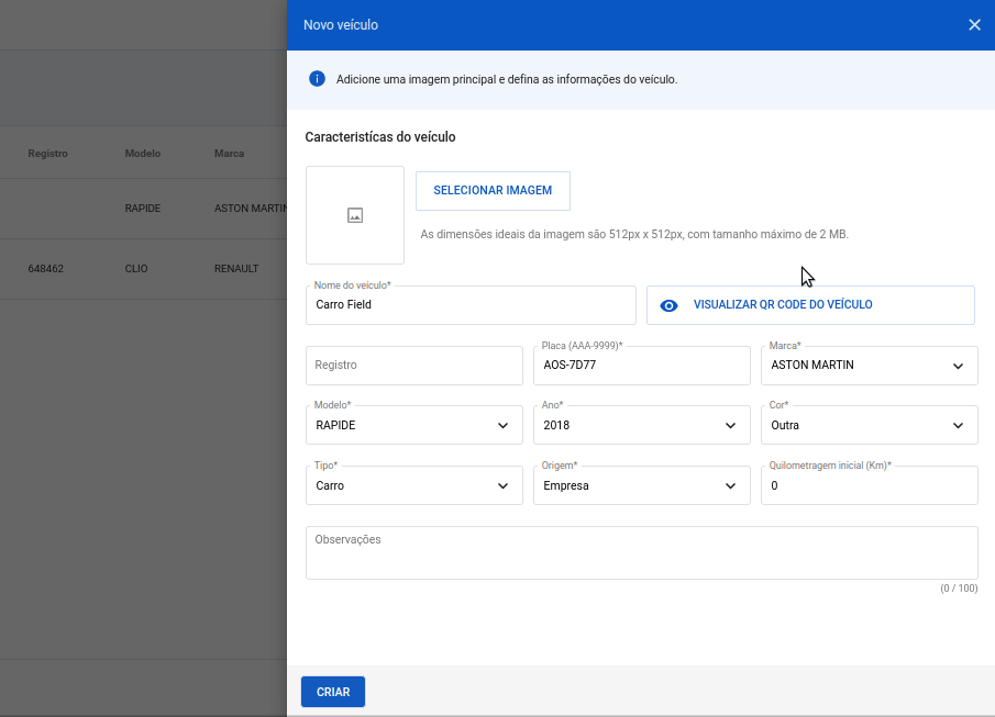 Passo 3: Agora, preencha os campos com os dados necessários, como nome do veículo, registro, marca, placa, ano, cor, modelo, tipo, origem e quilometragem inicial. Não se esqueça de incluir uma foto do veículo e se necessário, as observações.