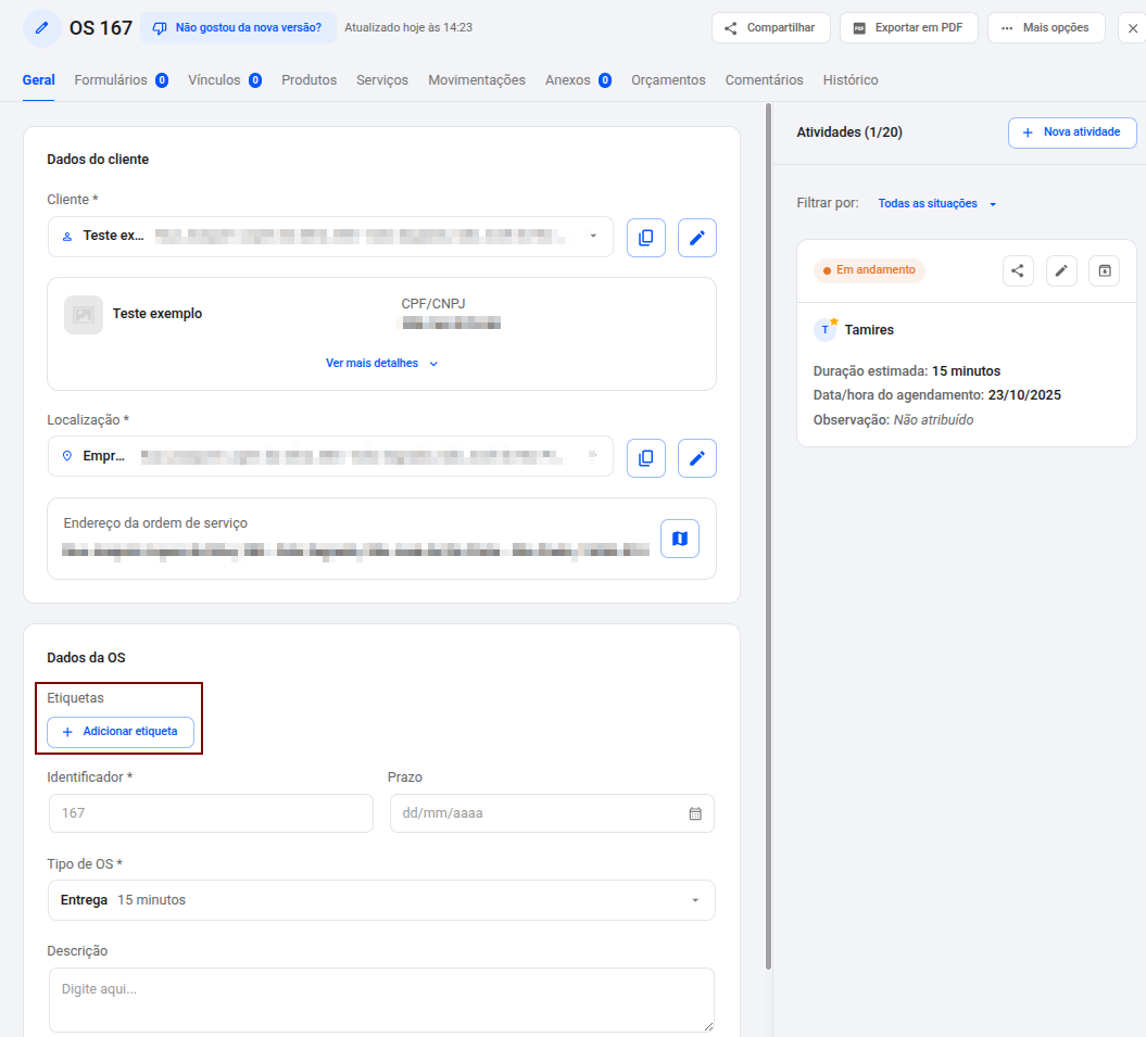 As etiquetas são muito utilizadas para manter um controle organizacional sobre as atividades que estão no painel de gestão. Com elas, os gestores conseguem organizar atividades que precisam ter um lembrete nessa ordem de serviço.