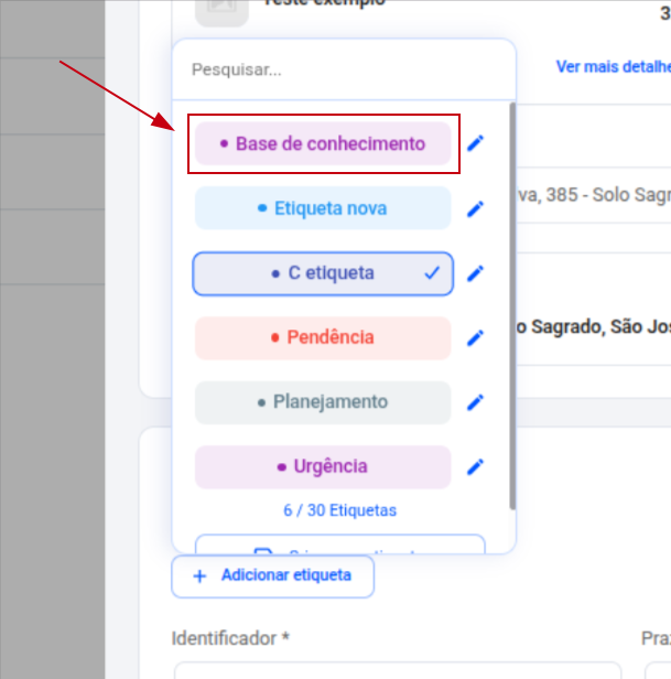 Clicando no ícone de etiqueta no canto superior, você pode cadastrar uma nova etiqueta, ou selecionar uma da listagem de etiquetas cadastradas