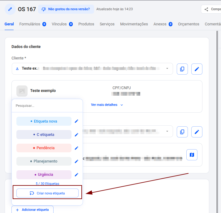 Pronto! A etiqueta foi criada, e agora é possível atribui-la a uma ordem de serviço e para fazê-lo é super simples, basta ir no mesmo ícone e clicar na etiqueta que deseja atribuir a essa nova atividade.