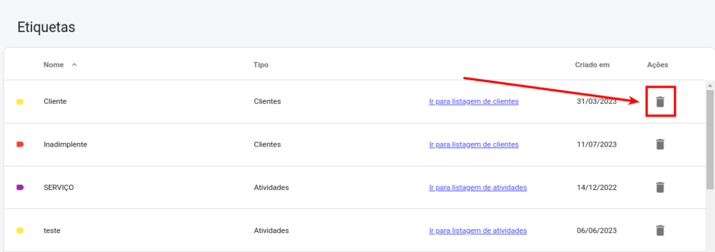 Passo 2: Na etiqueta deseja, clique no ícone lixeira para deletá-las.