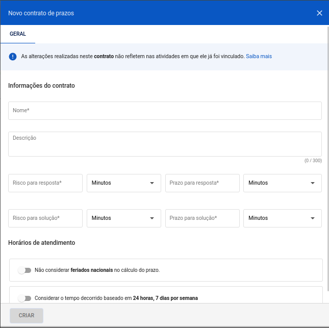 Após preenchê-lo, você pode configurar se deseja que esse contrato considere feriados nacionais e se o contrato deve considerar o tempo decorrido baseado em 24 horas, 7 dias por semana, através das configurações em Horário de atendimento.