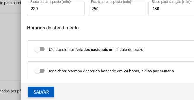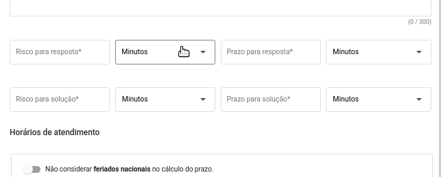 Passo 3: Você pode alterar os campos de Risco para resposta, Prazo para resposta, Risco para solução e Prazo para solução para o tipo de tempo que desejar. Pode ser em minutos, horas ou dias