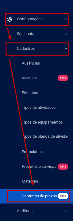 Passo 1: Com o módulo já ativado, agora será possível criar um contrato de prazo acessando as Configurações » Cadastros » Contratos de prazo.