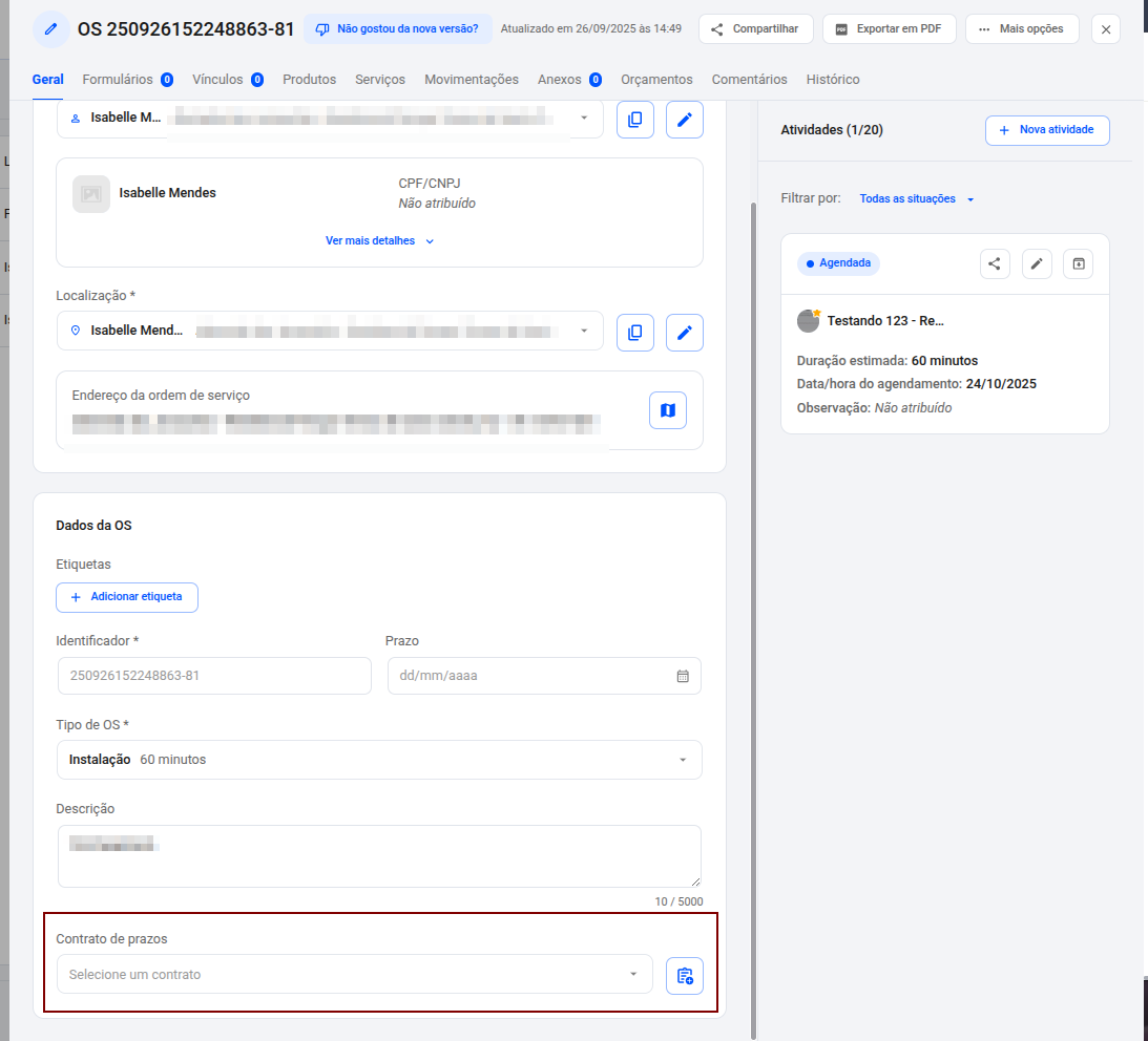 Com o contrato de prazo criado, agora podemos vinculá-lo a uma ordem de serviço. Isso pode ser feito na edição ou na criação de uma atividade.