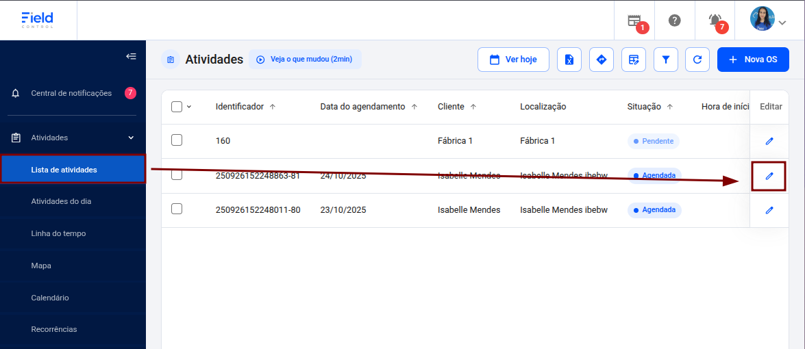 Passo 1: para inserir um contrato numa atividade já existente, devemos acessar a Lista de atividades e então clicar na atividade desejada, em Edição.