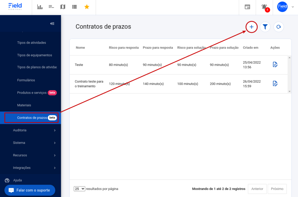 Prazo para solução: É o tempo limite que nosso cliente terá para solucionar a questão-problema prevista em contrato. No caso do Field esse prazo será registrado quando o colaborador finalizar a ordem de serviço.