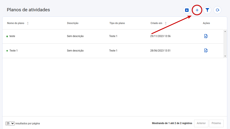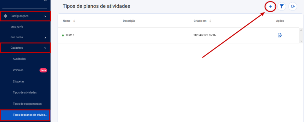 Passo 1: Os tipos serão cadastrados em Configurações » Cadastros » Tipos de planos de atividades. Nessa tela, basta clicar no ícone “+” no canto superior da tela