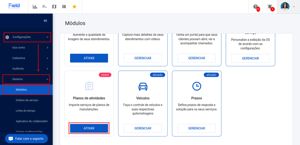 Com o módulo ativo, duas novas abas surgirão no menu Field: tipos de planos de atividade e planos de atividade.