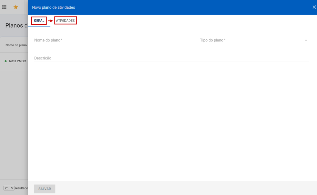 Passo 3: Após checar a planilha, seguimos para a aba Geral. Lá é possível definir um nome para o Plano de atividades, bem como seu tipo e uma breve descrição.