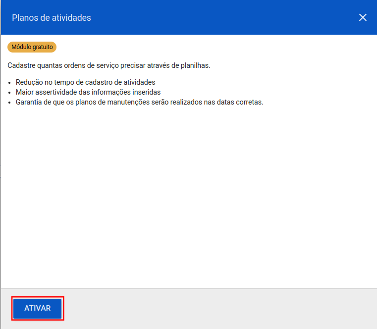 Passo 1: Para ativar vá em Configurações » Sistema » Módulos. Clicando em Ativar no módulo de Plano de atividades uma aba se abrirá, e você poderá conferir algumas informações sobre o módulo. Você pode confirmar a ativação clicando no botão Ativar dessa mesma aba.