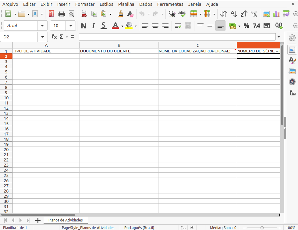Passo 1: Em Atividades » Plano de atividades, clique no botão Download da planilha modelo. Esse modelo de planilha deverá ser preenchida com os dados do seu Plano de atividade, ou seja, com as atividades que você deseja inserir no Field pelo Plano de atividades.
