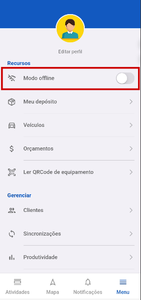 Passo 1: Para ativar ou desativar o modo offline basta acessar o “Menu” no app do colaborador